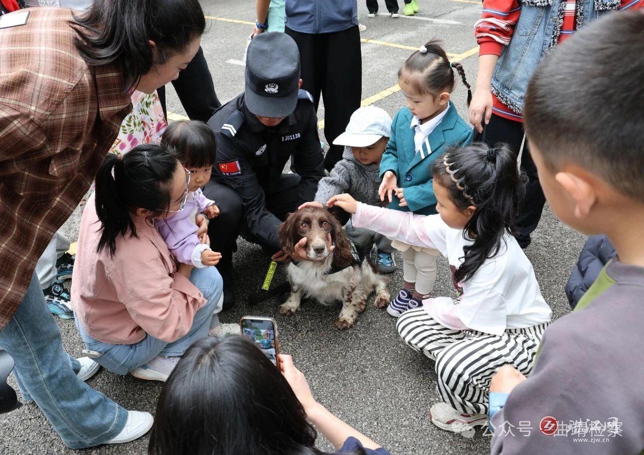 在训导员的指导和保护下,孩子们与警犬进行了近距离互动,了解警犬的日常生活和训练情况。