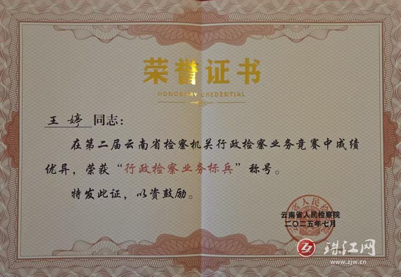 曲靖市马龙区人民检察院王婷荣获 “行政检察业务标兵”称号。