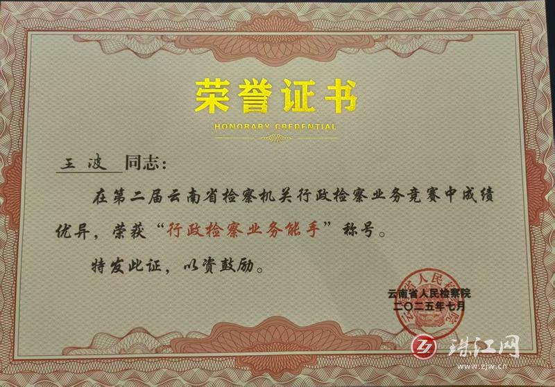 曲靖市富源县人民检察院王波荣获 “行政检察业务能手”称号。